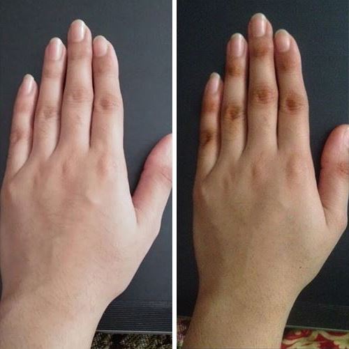 !تشير التعليمات إلى أنه يجب استخدام الكريم مرتين في اليوم لتحقيق تأثير مرئي، وهذا ما فعلته. كل مساء، وضعت الكريم على مفاصل يدي، وكوعي، وركبتي، وإبطي، و... منطقة البيكيني (قررت أن أفاجئ زوجي المستقبل في ليلة زفافنا). لم أشعر بأي إزعاج. بل على العكس، بدت بشرتي أكثر وأكثر عناية، ورطوبة، ونضارة في كل مرة. وفيما يلي يدي في اليوم الأول من استخدام Pure Glow وبعد أسبوع.